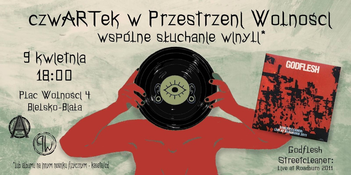 Rozpoczynamy nowy cykl wydarzeń, na którym wspólnie posłuchamy dobrej muzyki lub obejrzymy ciekawy film! Kwietniową płytą będzie Streetcleaner: Live at Roadburn 2011 zespołu Godflesh! Oprócz wspólnego doświadczania sztuki, chcemy kultywować słuchanie fizycznych nośników z muzyką oraz przypomnieć jak to jest słuchać albumu od początku do końca, co dzisiaj jest raczej rzadkością.